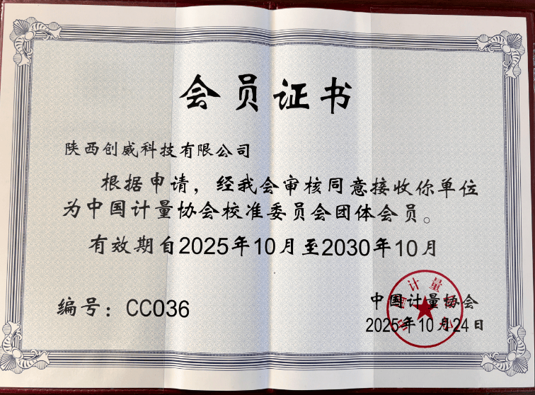 近日,陜西創(chuàng)威科技有限公司憑借卓越的技術(shù)實(shí)力、規(guī)范的管理體系與良好的行業(yè)聲譽(yù),正式通過審核,被接收為“中國(guó)計(jì)量協(xié)會(huì)校準(zhǔn)委員會(huì)團(tuán)體會(huì)員”。會(huì)員資格有效期自 2025年10月至2030年10月,為期五年。